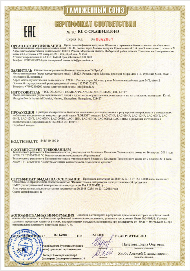 Сертификат на бытовые сплит-системы (серия Neon, Premiere)